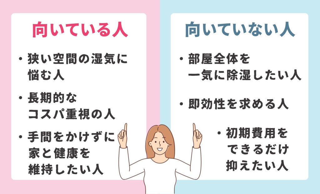 単なる除湿グッズではなく「手間をかけずに家と衣類と健康を守るための設備」と考えましょう。