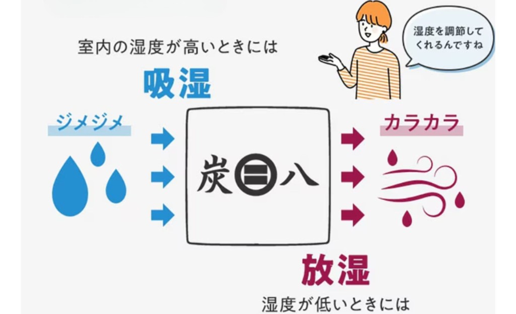 炭八は、部屋の湿気が多い時に湿気を吸い取り、乾燥している時に湿気を外に出します。